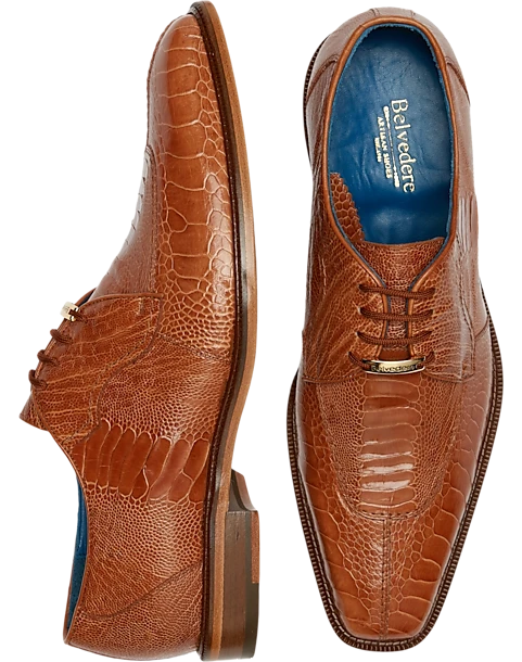 Create a refined look with these genuine ostrich oxfords by Belvedere. A subtly stitched, split moc toe and gold-tone logo bit detail these polished lace ups, while leather linings and a padded footbed offer long-lasting comfort.