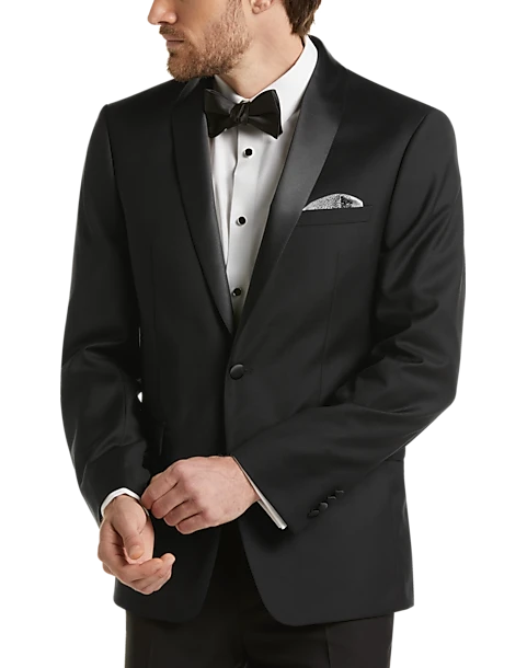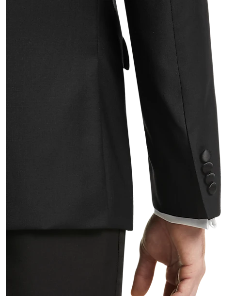 Two button. Side vents. Notch collar. Satin lapels. Satin buttons. Satin trim along hacking pockets. Slim Fit. TMW_3F1F_3F1G