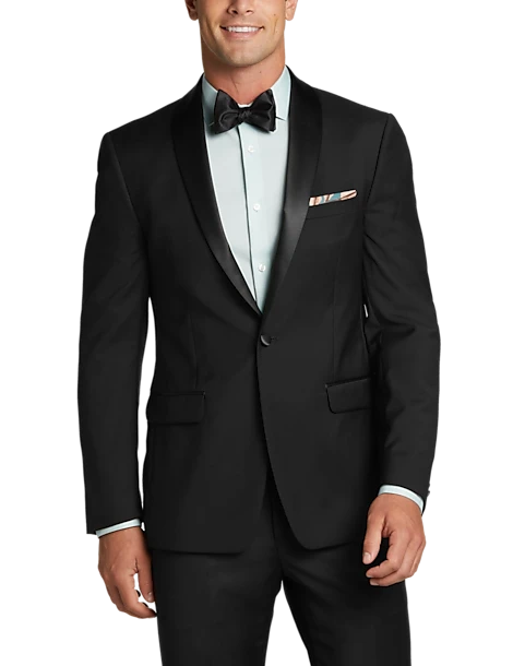 This stylish Calvin Klein tuxedo bundle features a standou tailored jacket in fine 100% natural stretch wool with smooth satin shawl collar, satin-covered buttons and satin trim at the pockets. The fine formal slacks feature a satin stripe detail and a smooth flat front.