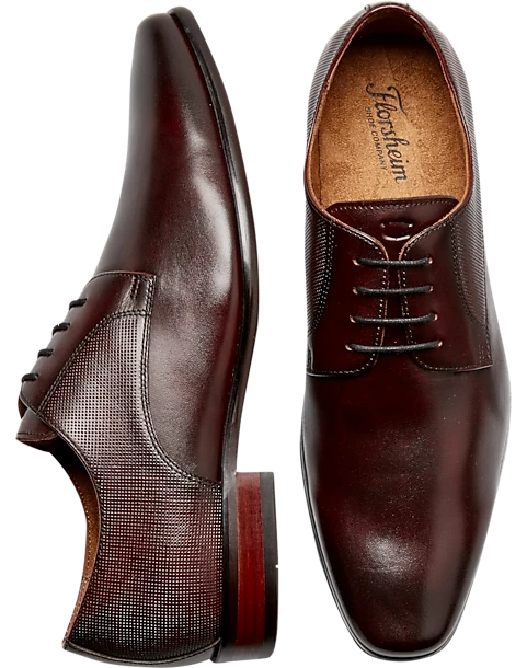 These smooth, understated oxford dress shoes by Florsheim feature polished plain toes and embossed, textured quarters. Sleek and slightly chiseled, the elongated toe gives this shoe a highly sophisticated silhouette. Add to that the contrast of the unique microperf detailed quarters and you have a classic shoe that is sure to turn heads.