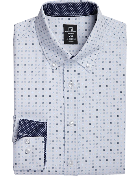 Flattering and comfortable, this dress shirt from Michael Strahan is tailored from four-way stretch fabric that retains its shape. Cuffs and lining in a contrasting yet complementary hue lend a fashionable finish to the look. Modern Fit is close-fitting without being constricting through the chest, body, and sleeve. Recommended for more rectangular body types (shoulders aligned with hips, with the waist slightly smaller).