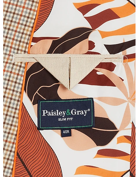 - 64% polyester 34% rayon 2% spandex|Double breasted|Peak lapel|Side vents|Coordinating pieces sold separately|Slim Fit|Paisley & Gray|