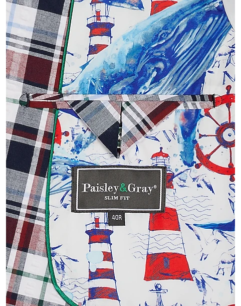 - 100% cotton|Two button|Notch lapel|Side vents|Flap pockets|Coordinating pieces sold separately|Slim Fit|Paisley & Gray|
