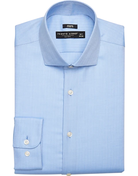Classic styling and easy-care come together in this dress shirt from Pronto Uomo. The herringbone pattern adds detail, while the no-iron material means less work for you. Classic Fit has more room in the chest and shoulders, with traditional armholes and fuller sleeves without being baggy. Recommended for fuller body types (large shoulders and upper arms, and a fuller waist).